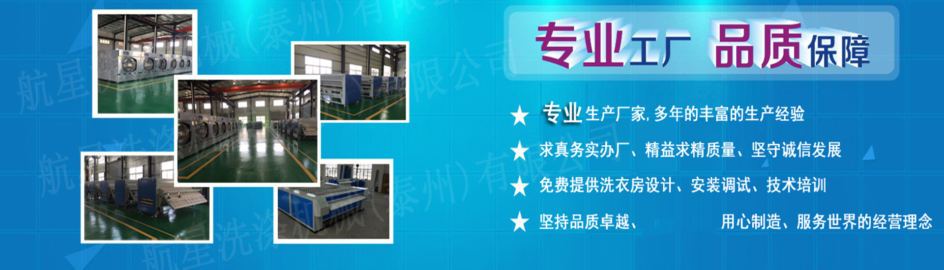 航星洗滌機(jī)械(泰州)有限公司位于江蘇泰州,是生產(chǎn)制造服裝洗滌機(jī)械、洗衣房設(shè)備,賓館、酒店等洗衣房設(shè)備的專業(yè)廠家,自創(chuàng)辦以為憑借著優(yōu)秀的產(chǎn)品較高性價(jià)比、售后服務(wù)好等特點(diǎn),獲得了較多消費(fèi)者的好評. 我公司主要提供洗滌機(jī)械、洗滌設(shè)備、洗衣設(shè)備等產(chǎn)品的開發(fā)生產(chǎn)與銷售,所銷售的洗滌機(jī)械產(chǎn)品,型號齊全、規(guī)格多樣,其中有:工業(yè)洗衣機(jī)、洗脫兩用機(jī)、洗脫烘一體機(jī)、服裝石磨水洗機(jī)、襪子染色機(jī)、絲綢砂洗機(jī)、脫水機(jī)、脫油機(jī)、脫油烘干機(jī)、烘干機(jī)、燙、熨平機(jī)、蒸氣燙臺、地毯清洗機(jī)等 洗滌機(jī)械產(chǎn)品。產(chǎn)品廣泛應(yīng)用于紡織、水洗廠、漂染廠、砂洗廠、印染、絲綢、服裝以及化工乳膠業(yè)、賓館、飯店、醫(yī)院、招待所等行業(yè)。    我公司堅(jiān)持“以質(zhì)量求生存,以科技發(fā)展為目標(biāo)”的企業(yè)宗旨,不斷提高關(guān)鍵工序的生產(chǎn)能力,建設(shè)現(xiàn)代化企業(yè)管理制度,開拓市場,加強(qiáng)國內(nèi)國外銷售網(wǎng)絡(luò)。我公司注重產(chǎn)品質(zhì)量和信譽(yù),產(chǎn)品不僅暢銷全國而且出口東南亞等地。 航星洗滌機(jī)械(泰州)有限公司竭誠歡迎國內(nèi)外客戶到我公司進(jìn)行參觀及購買我公司的洗滌機(jī)械產(chǎn)品,我公司相信規(guī)格齊全、價(jià)格公道的洗滌機(jī)械產(chǎn)品總有一款適合您。